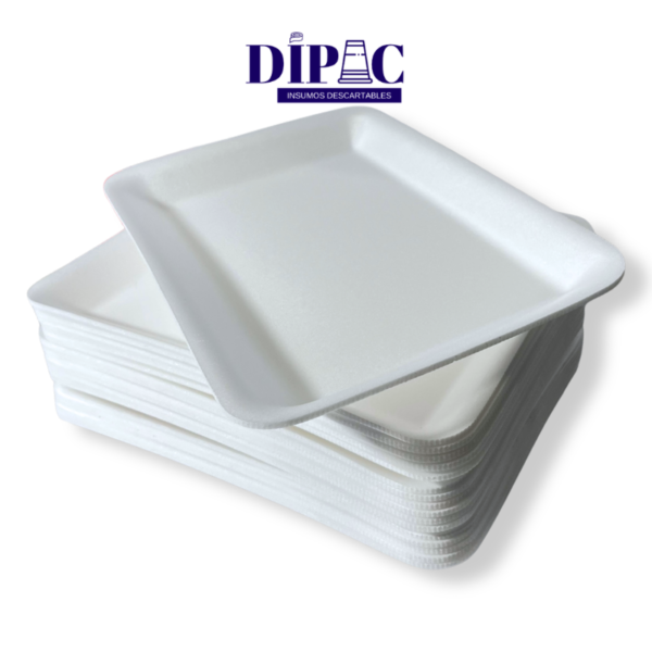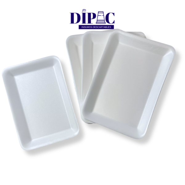 Bandeja de poliuretano expandido (EPS) de gran formato, medida 21 x 29 cm. Ideal para piezas enteras, pollos, asado y combos familiares. Presentación en bolsón cerrado por 200 unidades