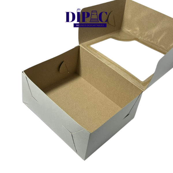Caja premium de cartulina blanca con ventana de PVC transparente. Medida cuadrada de 22 x 18 x 10 cm. La mejor opción para exhibir tortas, budines y combos de pastelería.