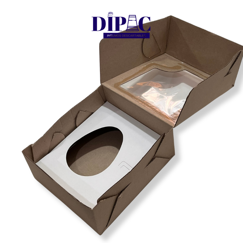 Caja de cartulina premium con ventana de PVC. Medida 18 x 15 x 8 cm. Diseñada específicamente para la presentación de un medio huevo relleno o decorado.