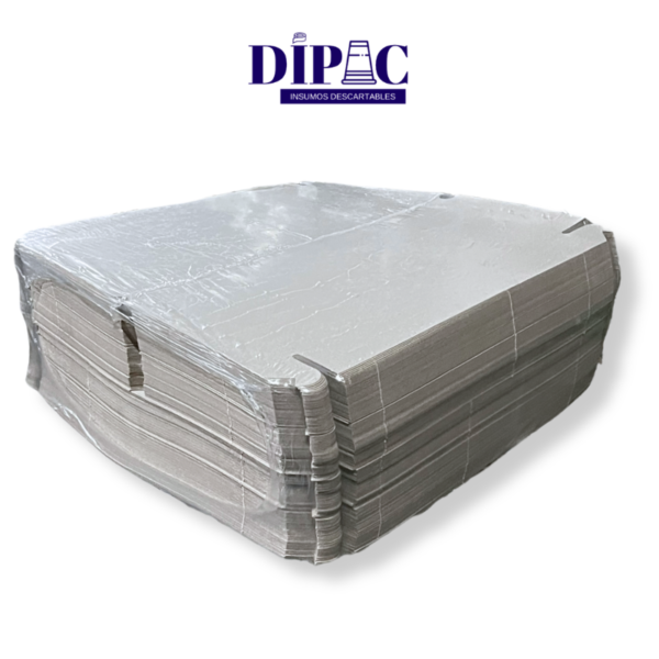 Caja de cartón gris de alto gramaje, medida 31 x 31 x 4 cm. Sistema de base y tapa separadas. Presentación en bulto de 100 unidades. Mayor resistencia estructural para delivery exigente.