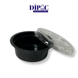 Pote degustación Black de 25 cc, resistente y elegante. Opcional con tapa transparente a presión para un cierre seguro. Caja por 2000 unidades.